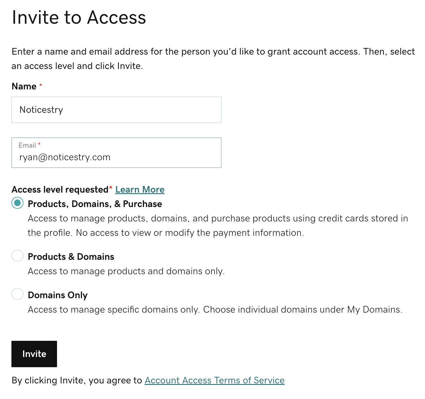 It is important to choose the correct level of access, choosing Domains only will not allow us into other products on your account.